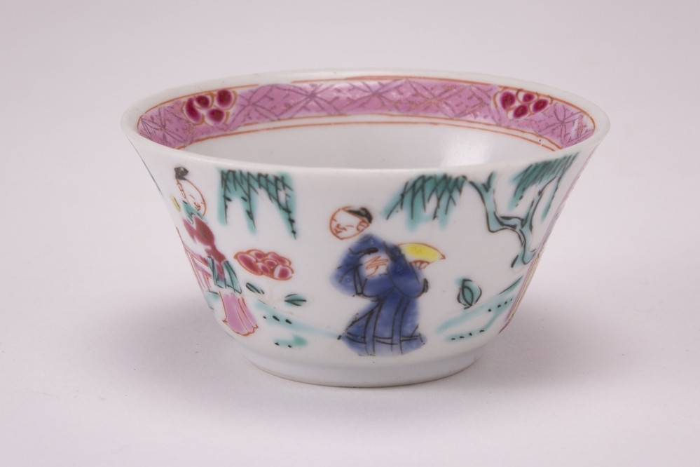 Bell-shaped cup with a crane near a peony plant and rock