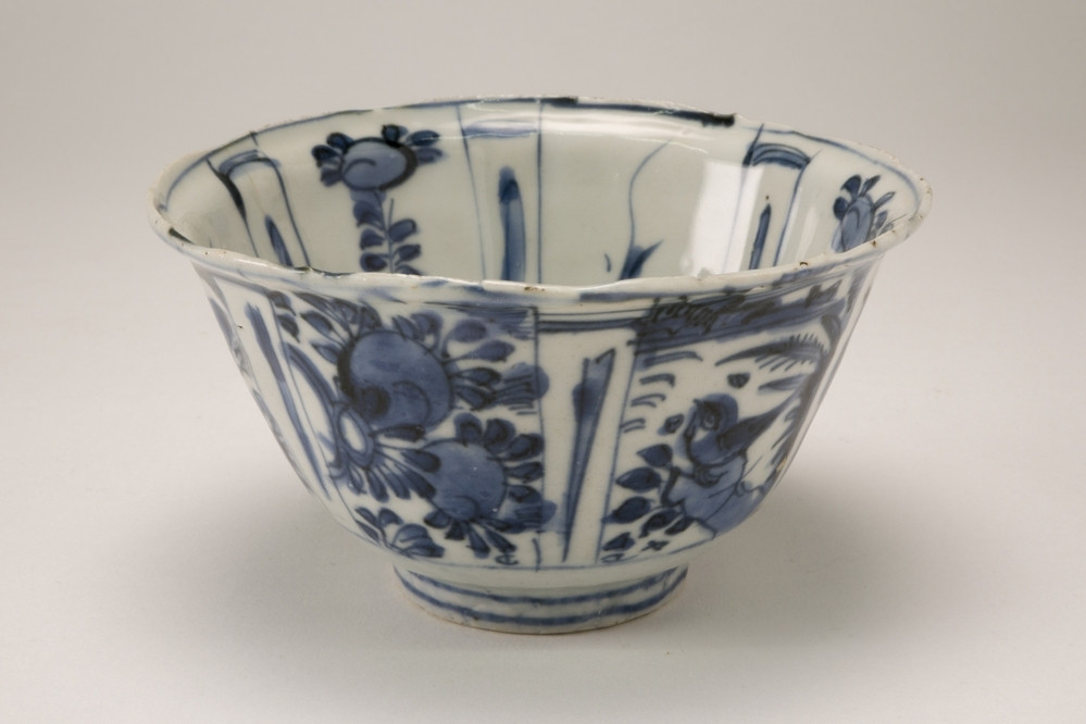 Rijksmuseum Amsterdam Bell-shaped cup and saucer with two figures in front of a pavilion and flower sprays