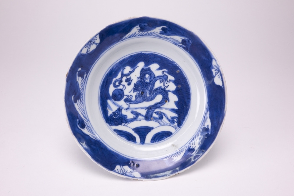 Bowl with pearl chasing dragons above swirling waves