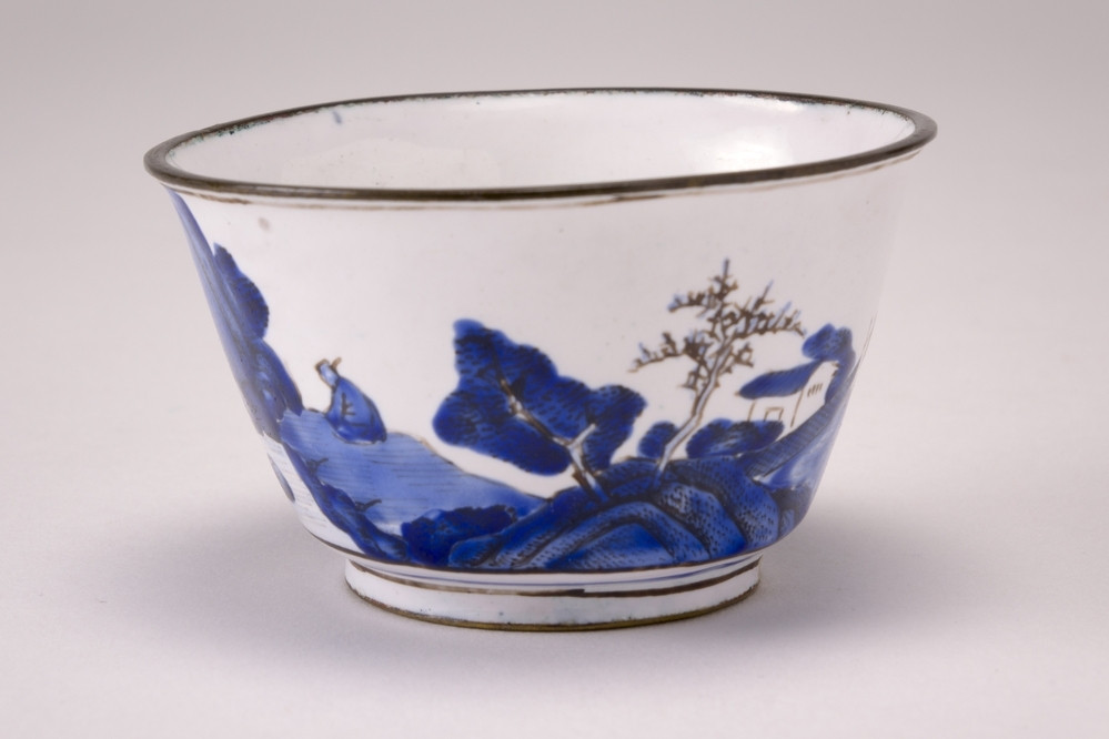 Cup and saucer with flower sprays behind a rock and fence