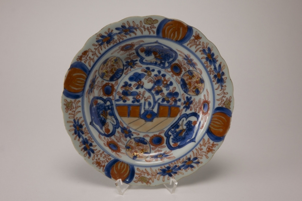 Saucer-dish with bamboo, prunus, tiger and a Chinese boy
