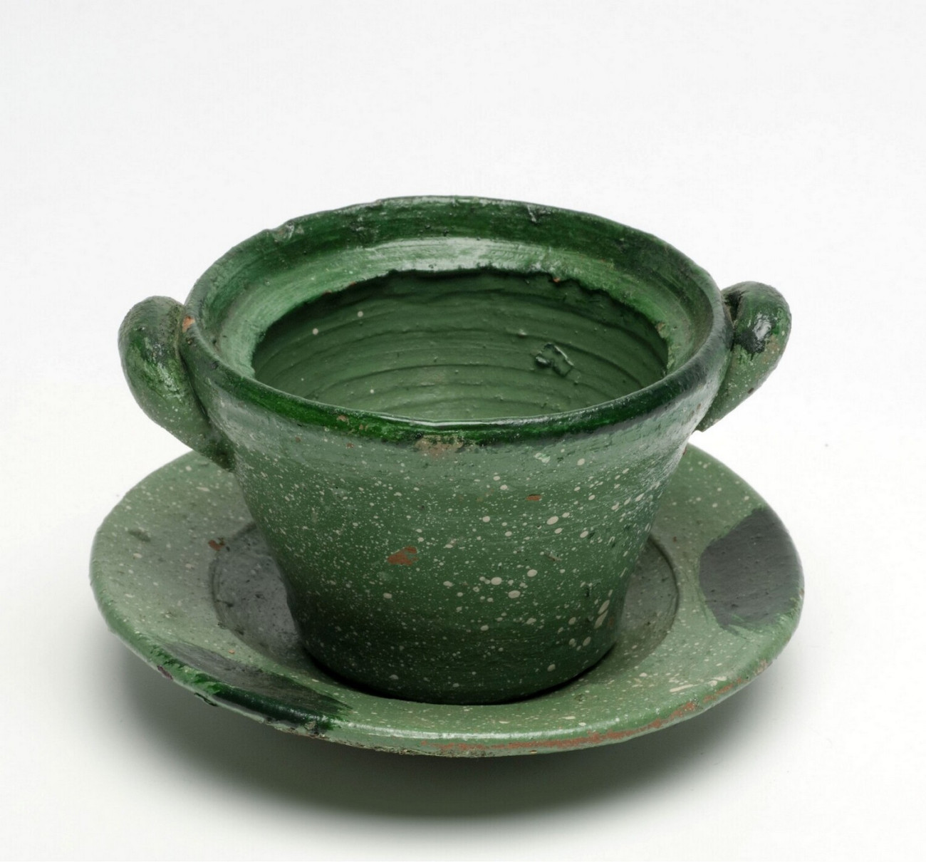 Bell-shaped cup and saucer with a cock on a rock with flowering plants
