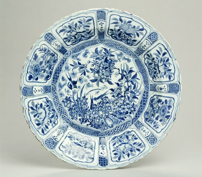 Keramiekmuseum Princessehof Kraaikop met decor van 2 vogels in oeverlandschap waaromheen vakken, kraakporselein