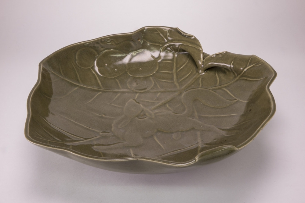 Keramiekmuseum Princessehof Schotel met decor van medaillon waarin opschrift omgeven door opspringende karpers en vegetatie, Swatow