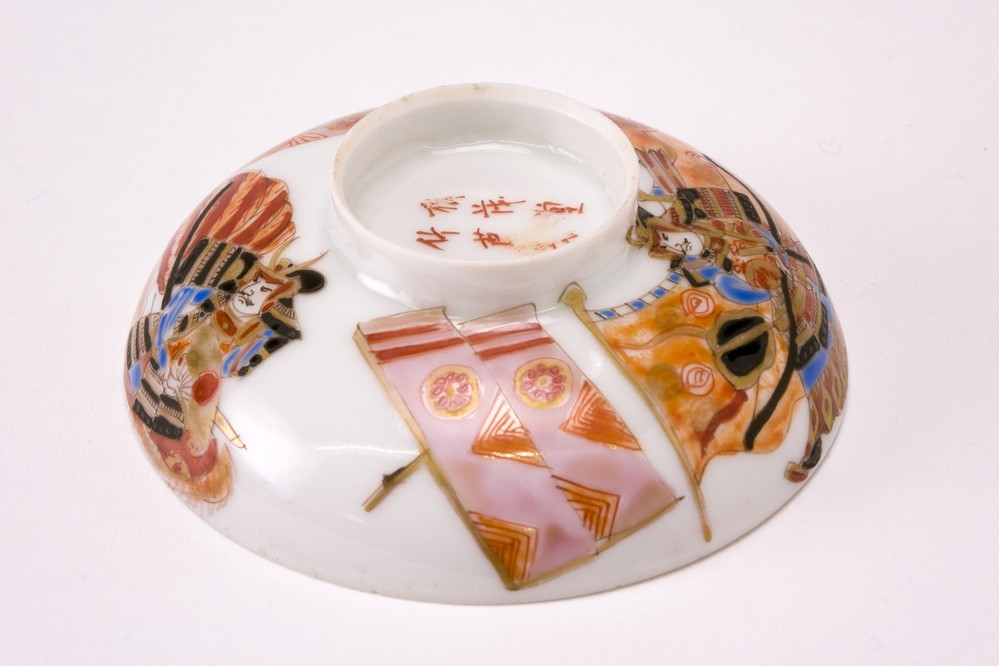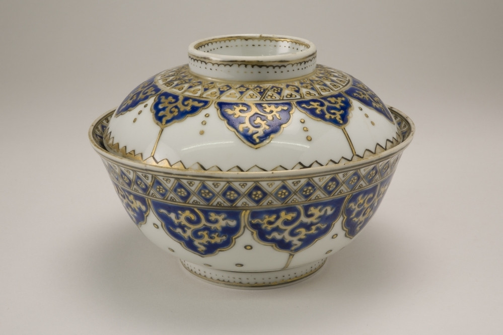 Keramiekmuseum Princessehof Pot met deksel, polychroom, met decor in Imari-palet van geisha's in de tuin
