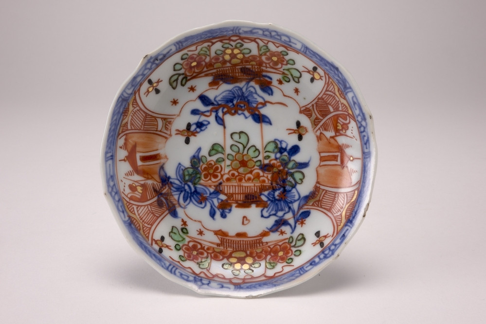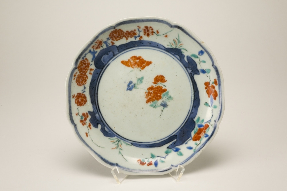 Keramiekmuseum Princessehof Schotel met geschulpte rand met decor van granaatappelvormige vlakken met bloemranken