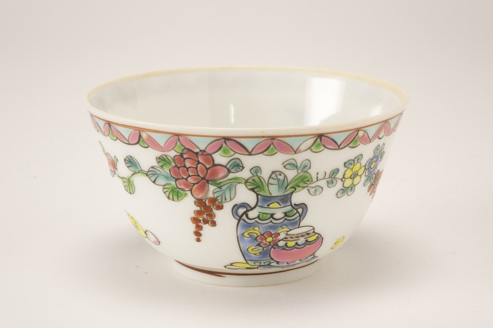 Klokvormige kop en schotel met drie groepen bloemranken