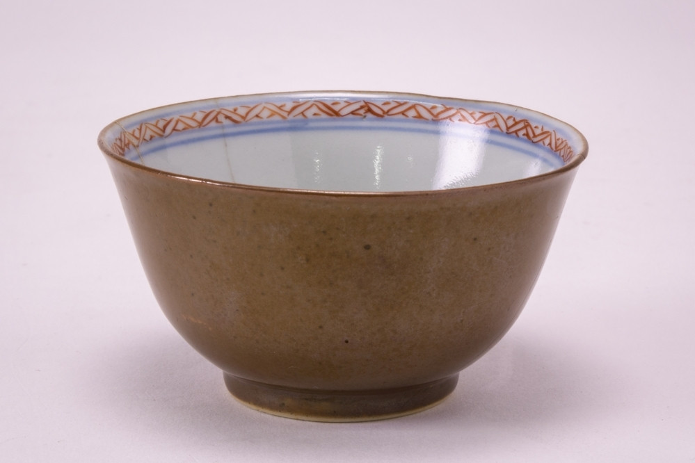Keramiekmuseum Princessehof Schotel als decor een onbekend familiewapen en op de rand een krullend bladmotief en cartouches met een zon, imari