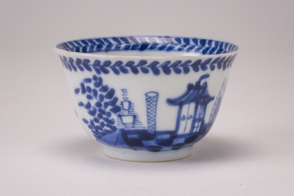 Rijksmuseum Amsterdam Klokvormige kop en schotel met een man en een vrouw in een interieur in een geschulpt cartouche
