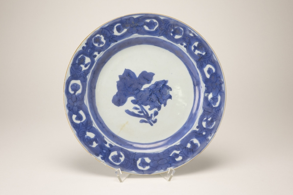 Keramiekmuseum Princessehof Schaaltje met decor De Vier Doktoren, voorstellende 1 staande en 3 zittende mannen in een tuin, chine de commande