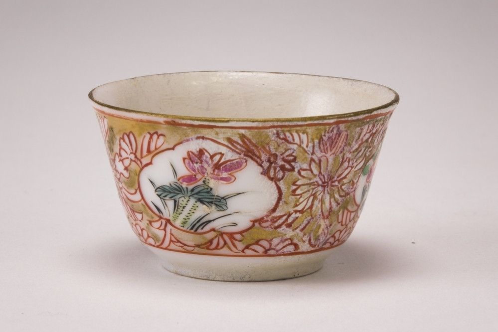 Keramiekmuseum Princessehof 3 kopjes met ingekrast decor en schildering van medaillons, waarin landschappen met figuren, anhua