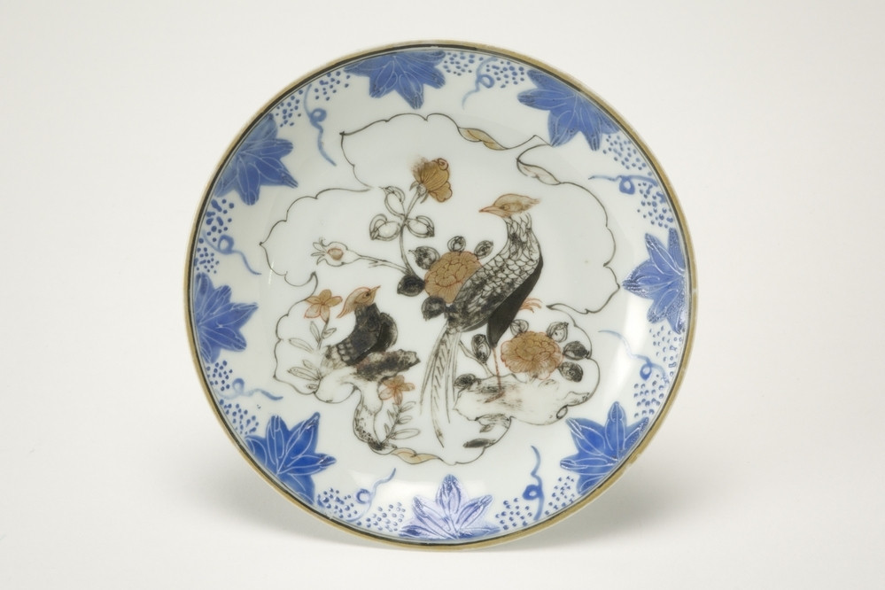 Schotel met decor van bloemvormig paneel waarin vlammende wielen