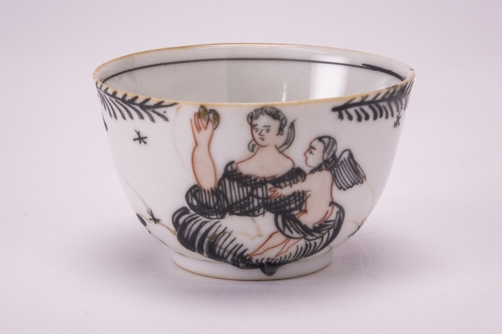Keramiekmuseum Princessehof Kop en schotel met decor van vakken waarin figuren of bloemranken, 1 van 13
