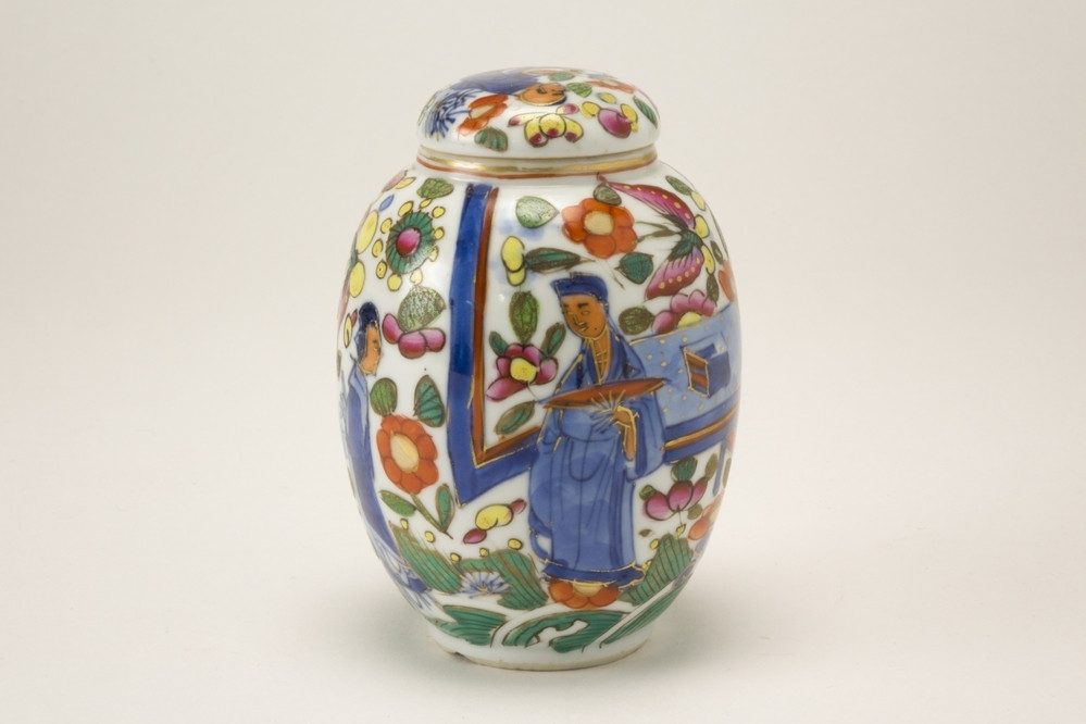 Keramiekmuseum Princessehof Bord, vierkant, wit email op koper, met polychroom decor van figuren in landschap