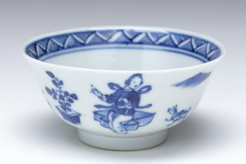 Rijksmuseum Amsterdam Kom met spelende jongens in cartouches tegen een rode achtergrond met bloemranken