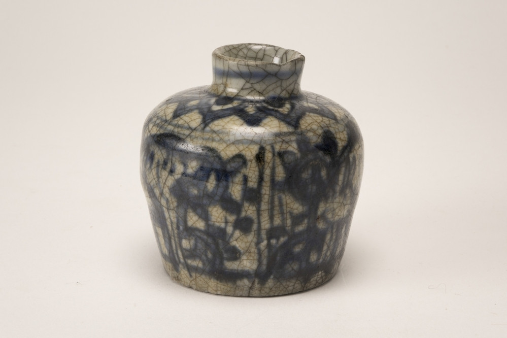 Keramiekmuseum Princessehof Pot, wijnpot, hu, groen geglazuurd aardewerk met hoge hals, met 2 monsterkoppen met ringen op de schouder