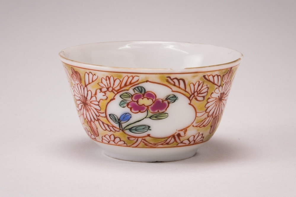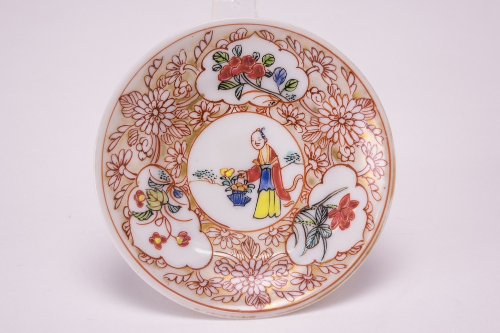 Keramiekmuseum Princessehof Schoteltje met intern een polychroom imaridecor van bloeiende planten, extern bruin