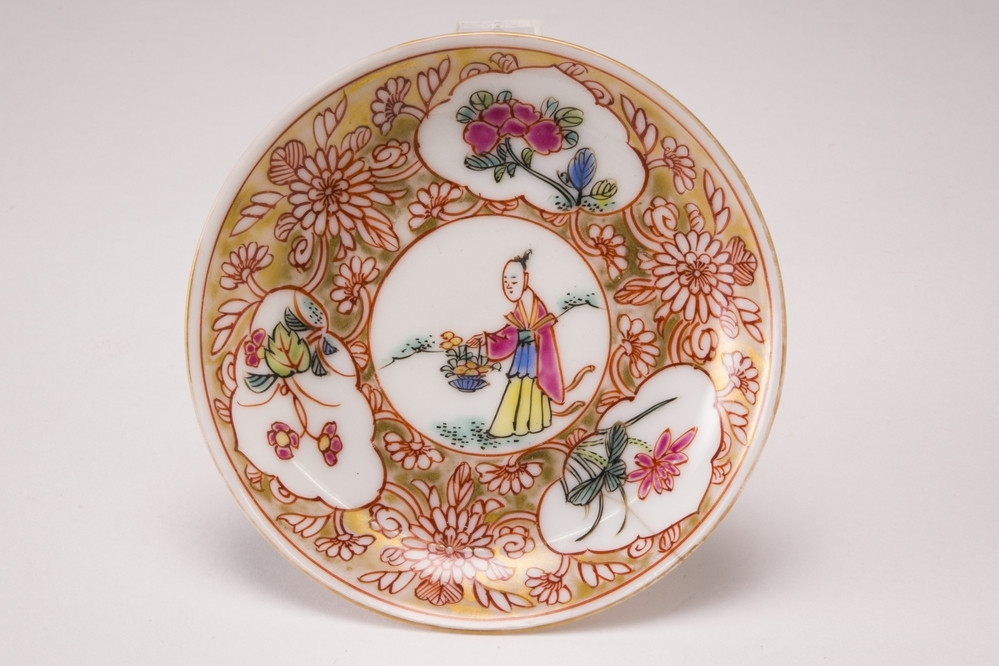 Keramiekmuseum Princessehof Bord met verfijnd decor van dame met 2 jongetjes temidden van de Honderd Oudheden, famille rose