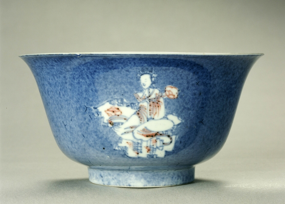 Wereldmuseum Aardewerken kom met beschilderde versieringen in golf- en kruislijnen, zowel aan de binnen- als de buitenkant