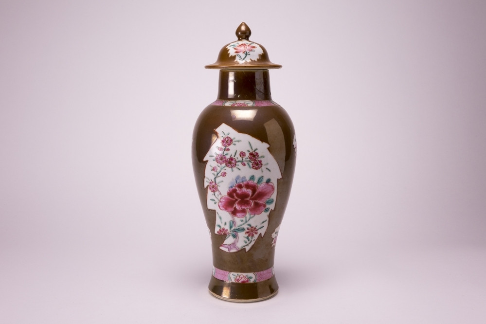 Dekselpot op hoge voet met vrouwen, bloemtakken en vazen