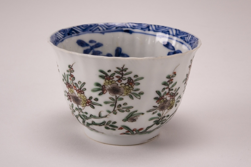 Keramiekmuseum Princessehof Miniatuurfles, rond met 5 verticale inkepingen langs de buik, met bloeiende planten in deze 6 vakken