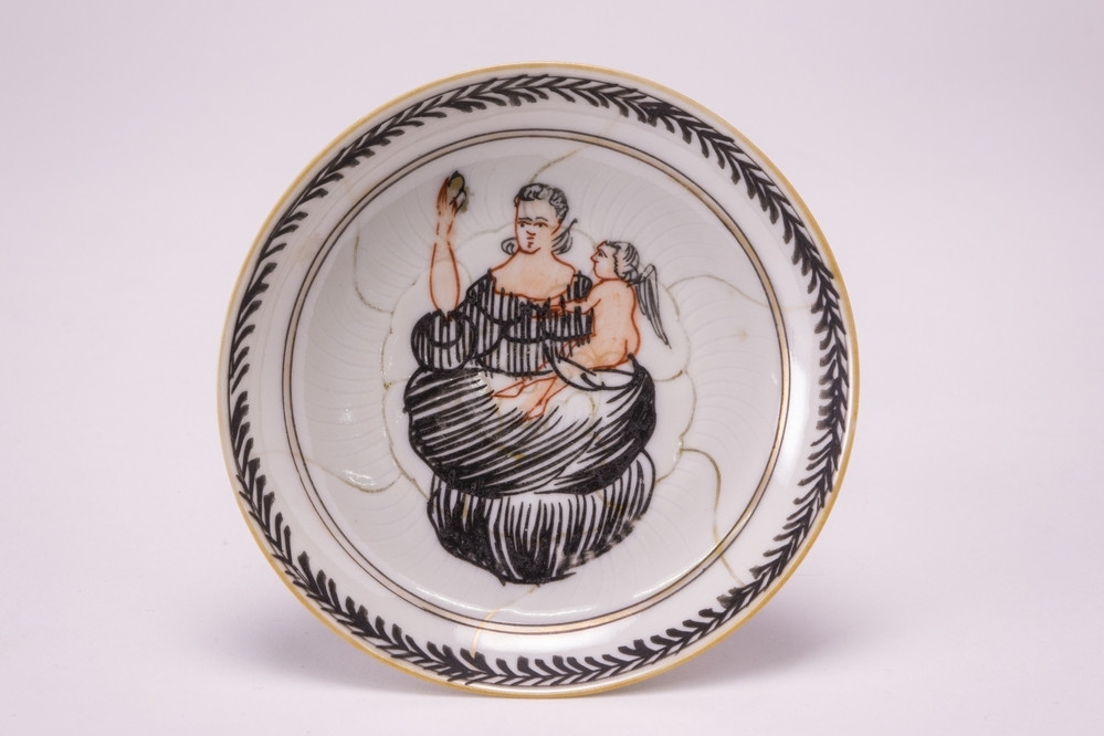 Keramiekmuseum Princessehof Schotel met decor van medaillon waarin vogel omgeven door rand met vogels en bloemen, Swatow