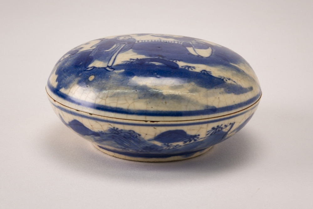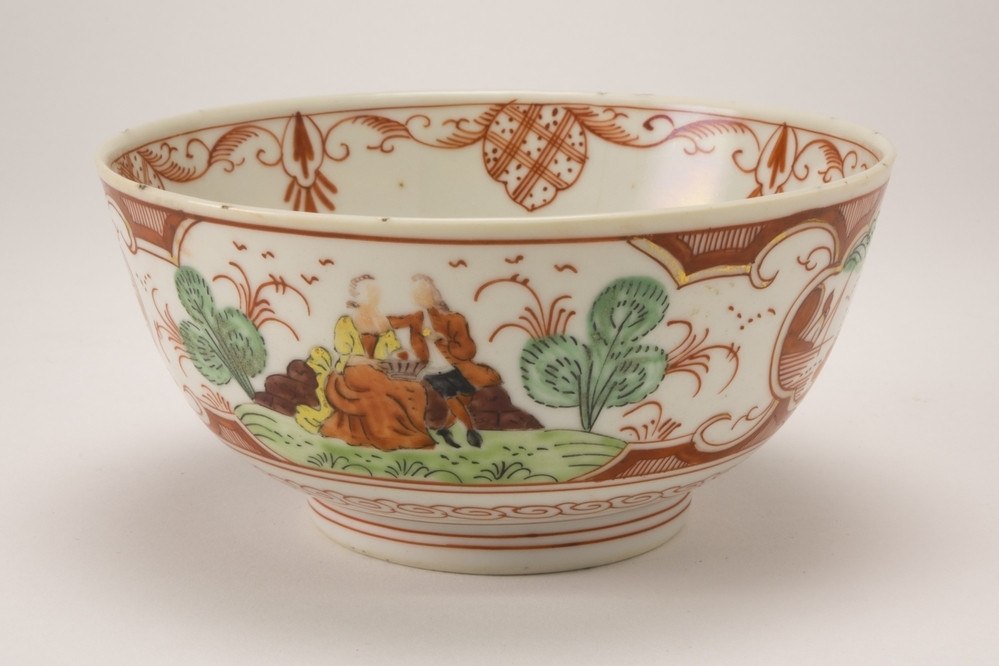 Keramiekmuseum Princessehof Schotel met decor van tuinterras met 2 dames die waaiers dragen, melk en bloed