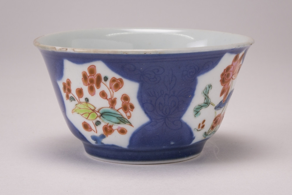 Kop met polychroom decor van bloemenrand rond rijstkorreltechniek