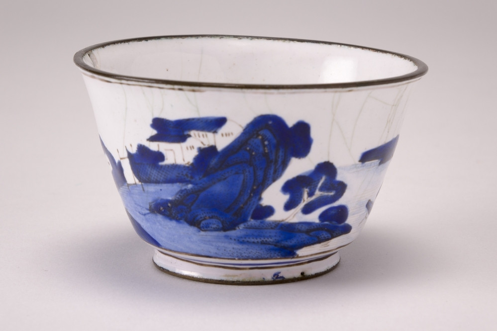 Bord met bloemtakken en personen in een interieur en in een landschap